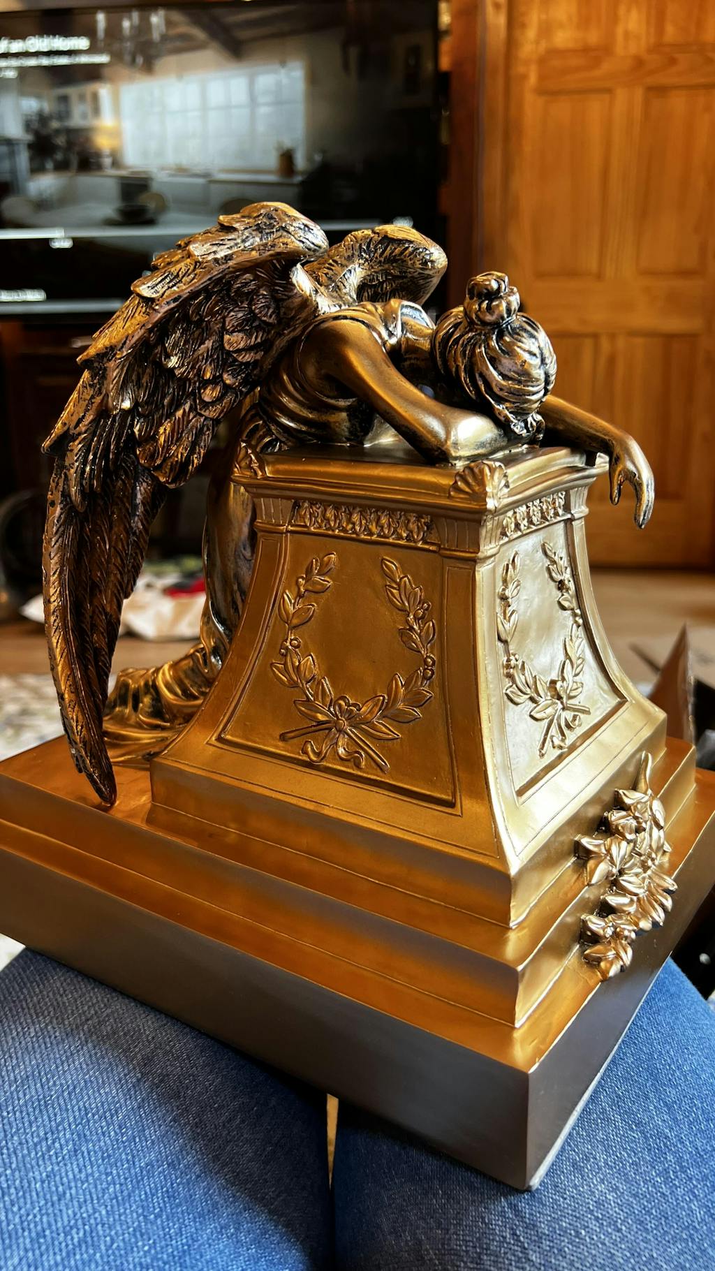 Angel of grief statue urn with bronze painted finish, showing details of the wreath and angel wings.