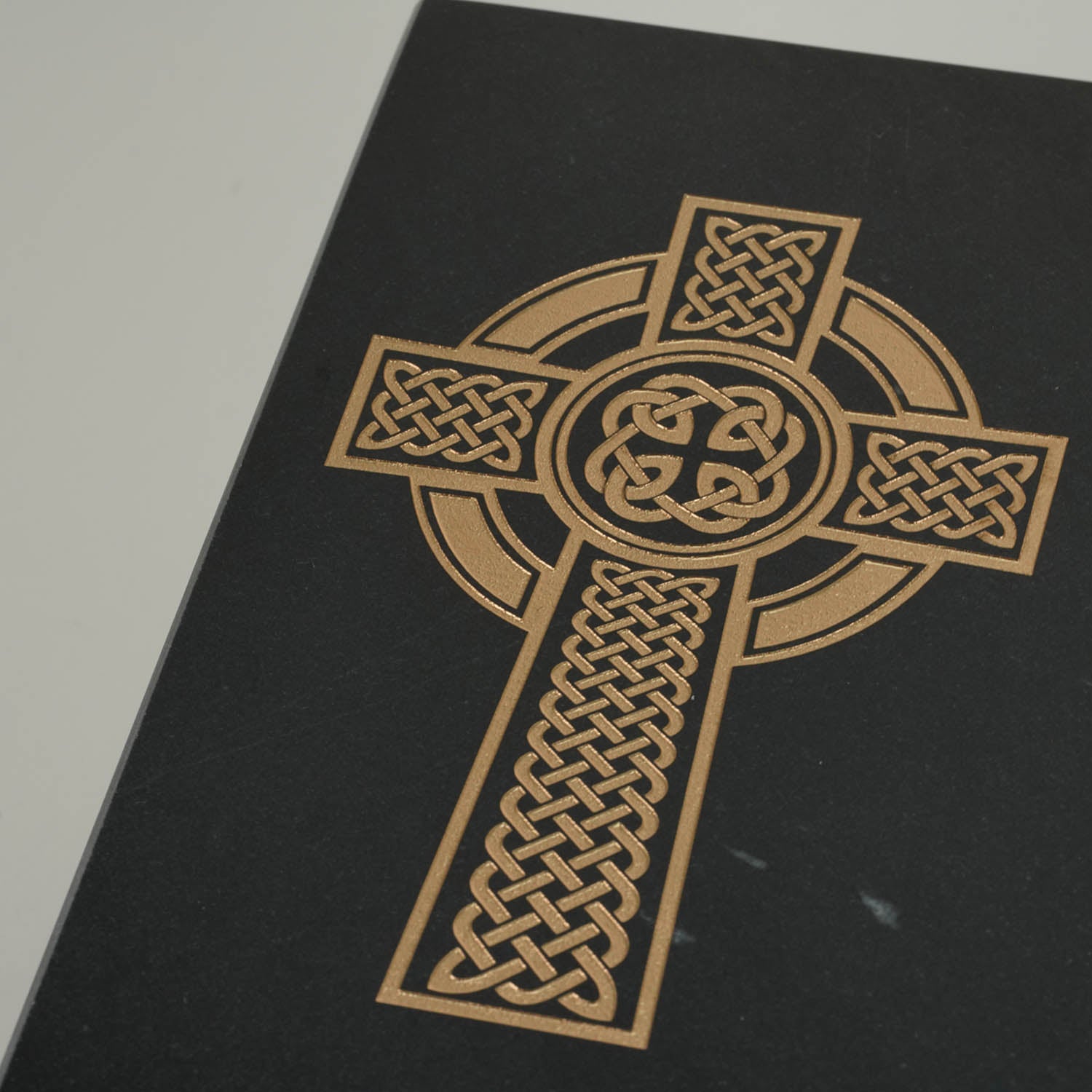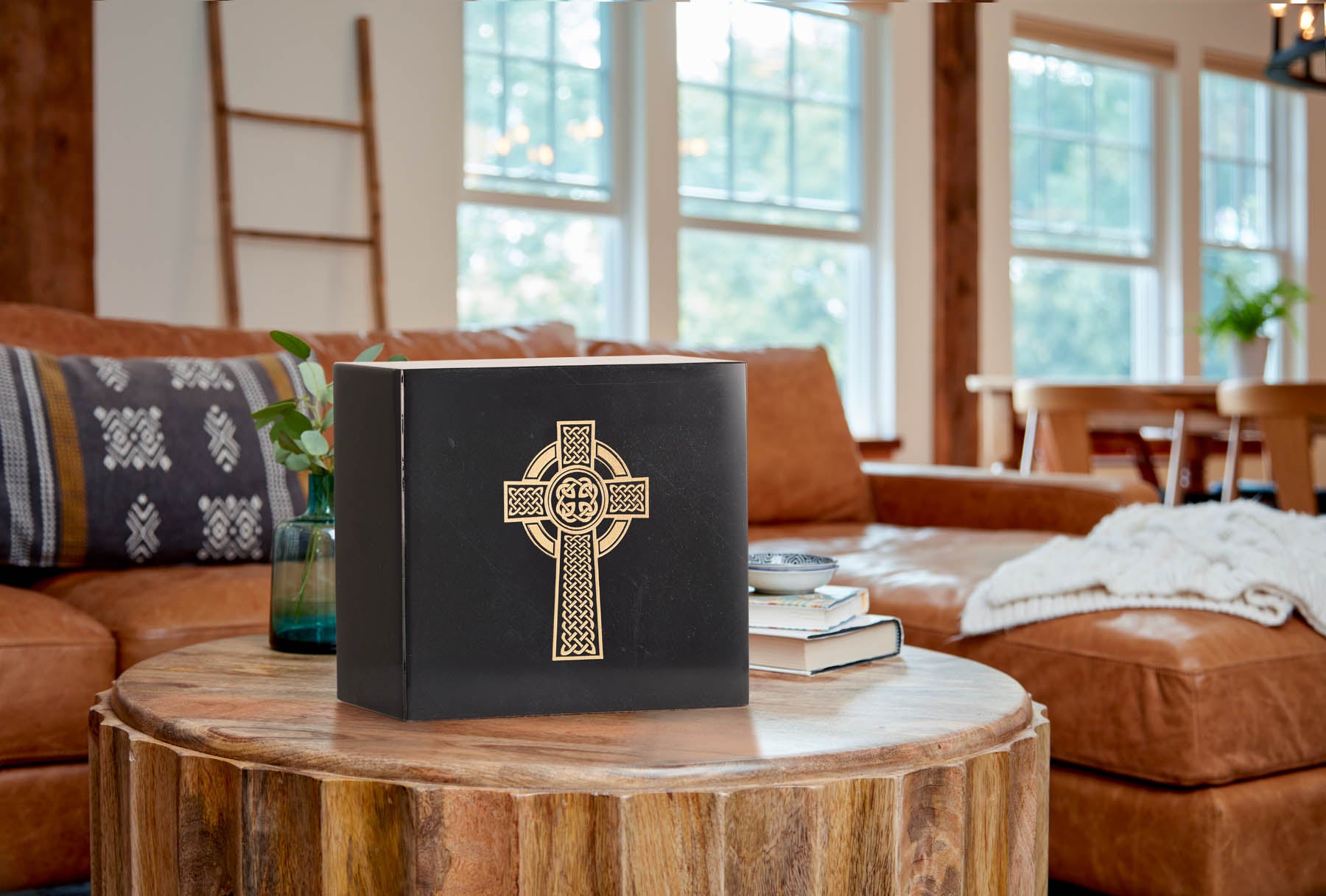 This Tailored Tribute urn carries a stunning design of gold Celtic Knot Cross giving it a multidimensional look without disrupting the smooth finish. Bring a deep sense of peace, love and the everlasting connection shared with your loved one with this beautiful, personalized urn.