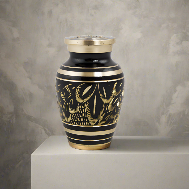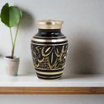 The OneWorld Memorials Elite Radiance Keepsake Urn for ashes has an elegant yet stylish edge that anyone can appreciate. The design has a soft bronze feathery appearance, creating a strong contrast to the black. Being a keepsake, it is ideal for sharing a small portion of ashes with friends and family.