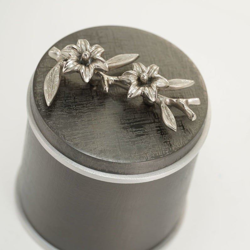 The perfect blend of delicate elegance and functionality, this dual-purpose keepsake contains a discreet compartment on the bottom for cremated remains, along with a larger compartment on top to store cherished mementos. Adorned with a stunning casted brass lily accent, finished in pewter, and a sophisticated textured deep slate finish, this keepsake evokes the warmth of treasured moments with loved ones. Let this keepsake serve as a long-lasting tribute, keeping your memories near and dear.