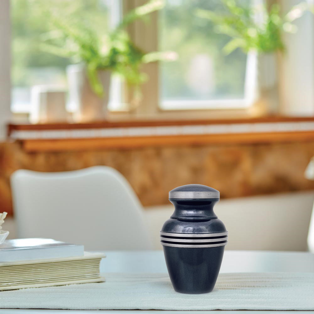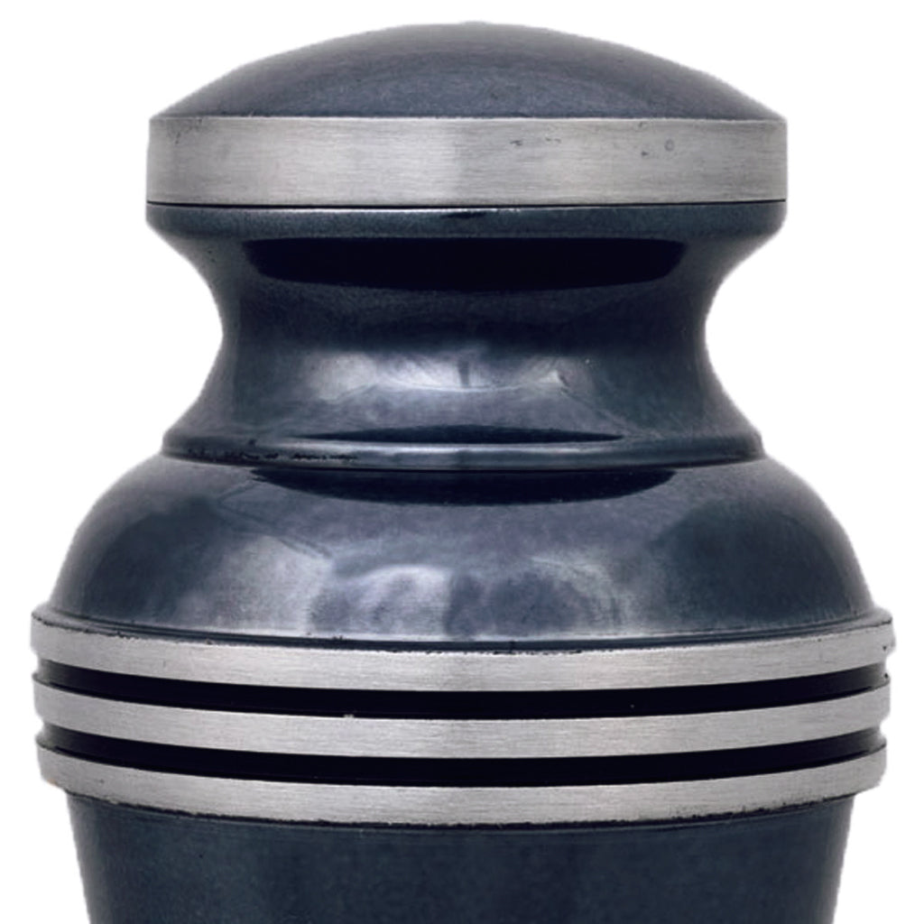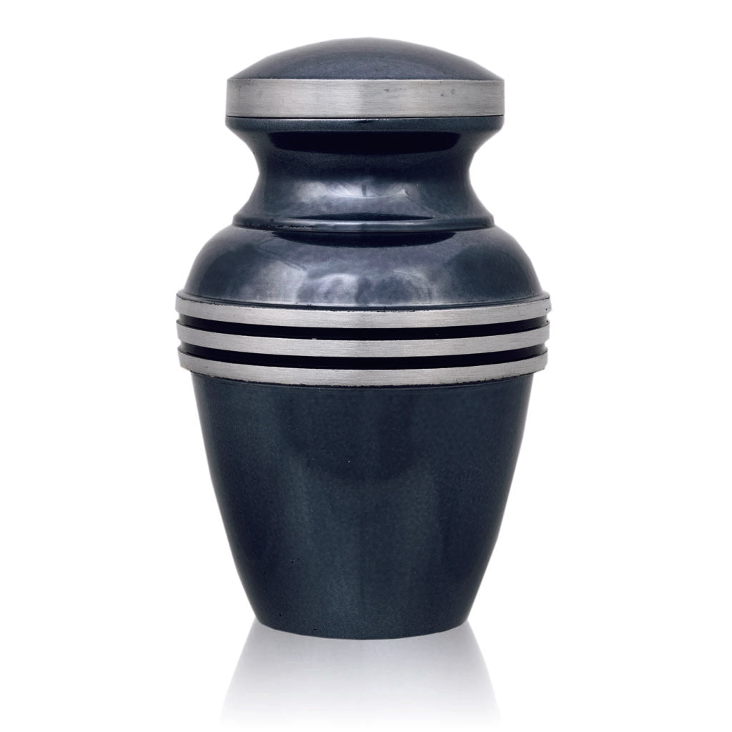 Minimalist in design, but grand in emotional potential, the Metallic Blue Banded Keepsake Urn can be your companion for years to come. Being a keepsake, it is ideal for sharing a small portion of ashes with friends and family. Reflecting light as well as exuding strength, this urn will fit elegantly into any decor. Beautiful accent bands in the middle and at the top provide the perfect finishing touch.