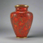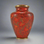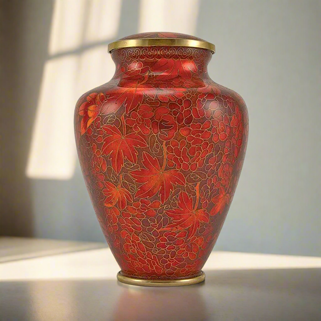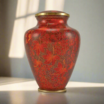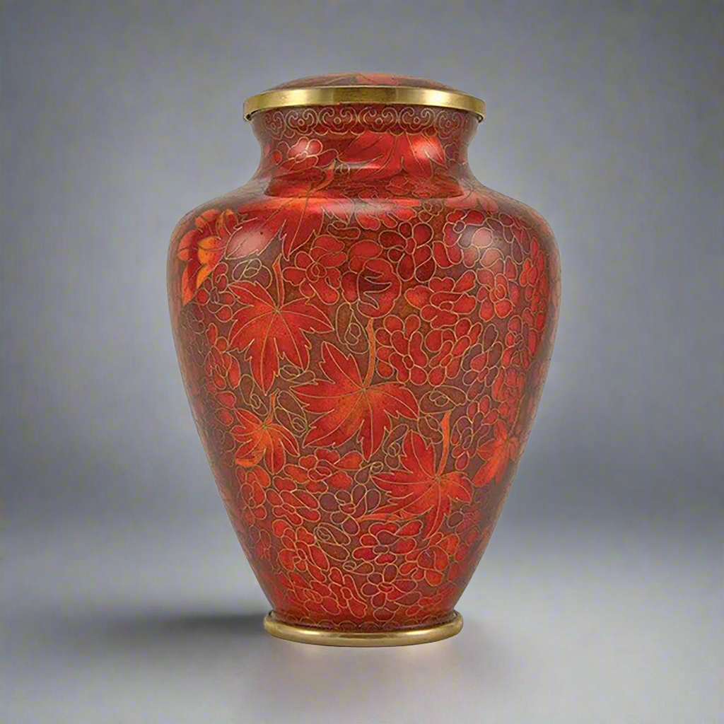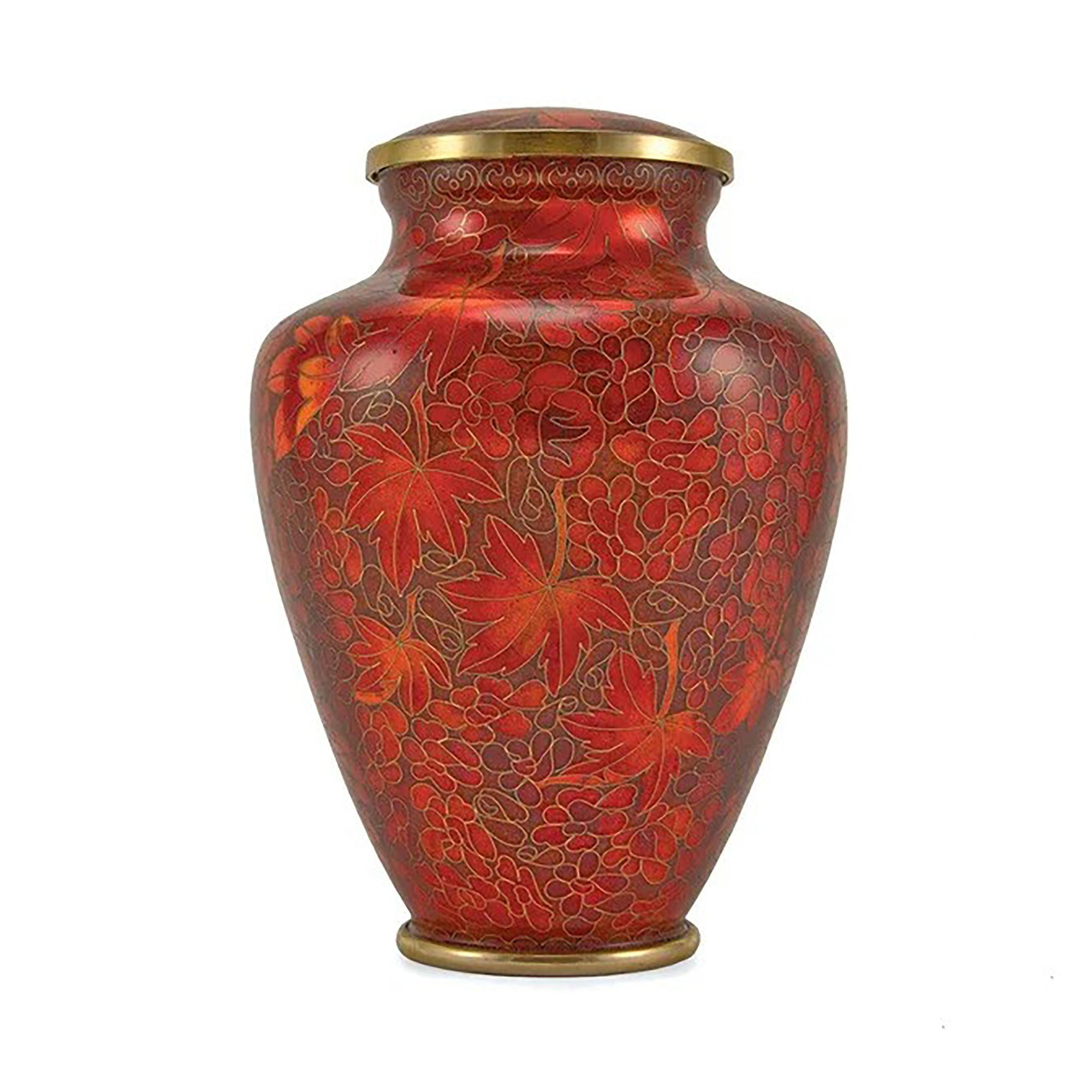 Bold and vibrant in its color and intricate design, this gorgeous Nouveau Leaves Cloisonne Cremation Urn is visually stunning. Its vivid red and orange colors and falling leaf motif evoke memories of beautiful fall days - and remind us that letting go is a natural part of life. The ancient method of using copper wiring as a decorative art form on enamel, plated in gold, showcases the delicate leaves on this exquisite urn.