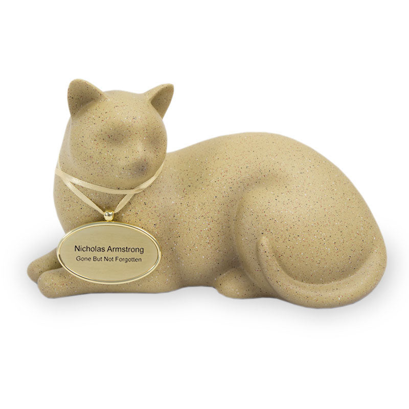 The Cozy Cat Cremation Urn In Fawn for pet ashes recalls precious memories of a cat and their family - because we were theirs just as much as they were ours. Thanks to its size and gentle color, it will effortlessly fit in any room that you decide to display it in.