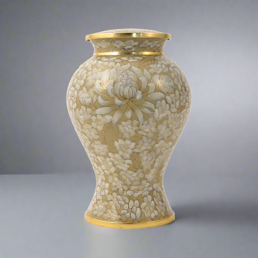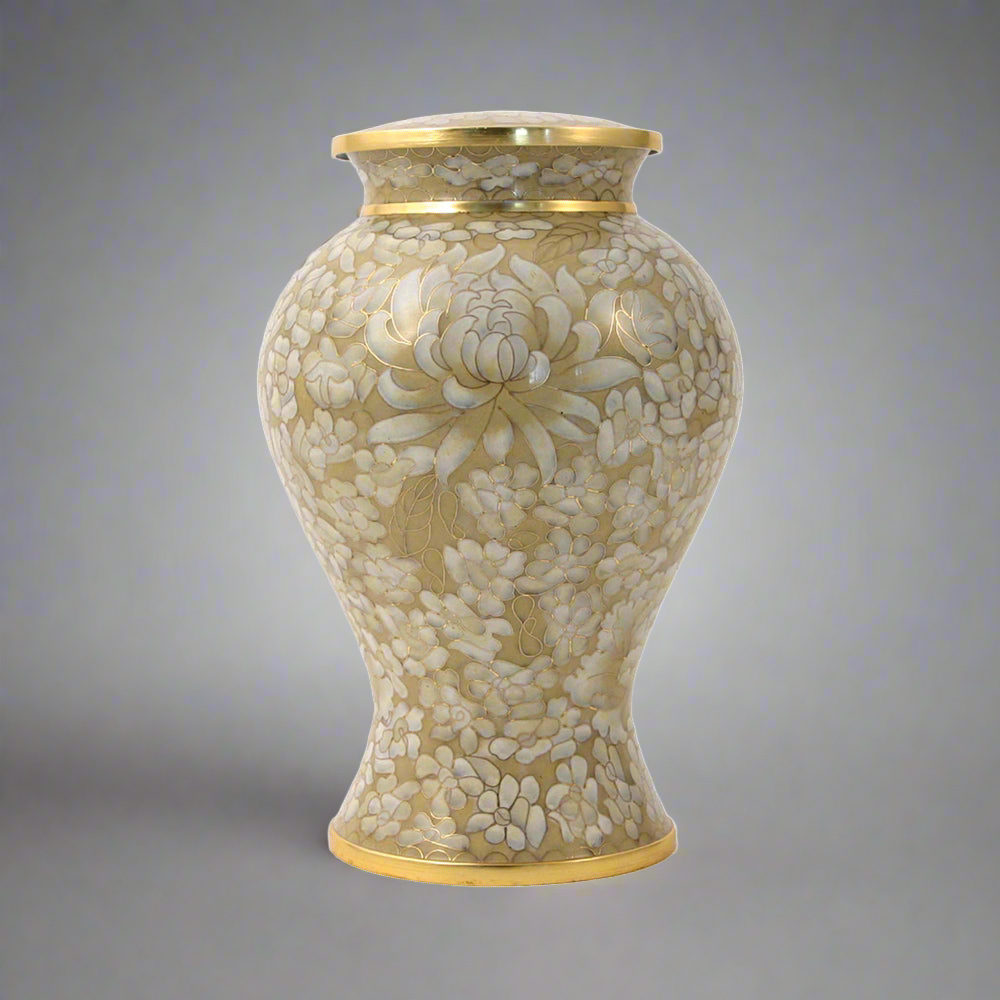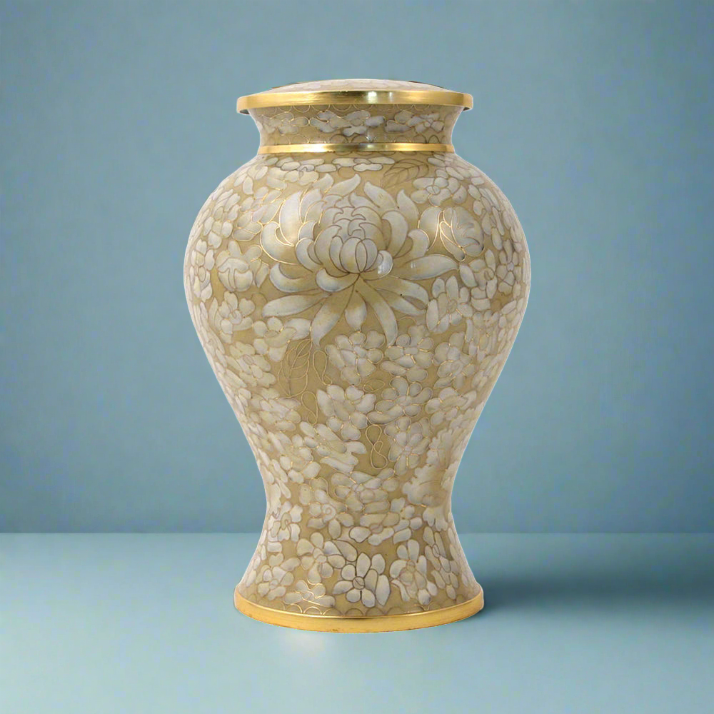 The Etienne Opal Cloisonné Cremation Urn is a wonderful way to celebrate the life of a loved one. The cloisonne pattern features an intricate floral pattern, with golden hued outlines in a gentle opal background. The golden bronze of the lid and trim around the neck of the urn will catch your eye, as a gentle reminder of all the love you shared.