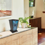 The Indigo Mission Style Stained Glass Cremation Urn is the ideal homage for you to commemorate your loved one with. The beautiful lamp features blue tones that evoke images of serene waters and clear blue skies, this mission-style stained glass urn looks stunning displayed on a shelf or inside a lighted cabinet.