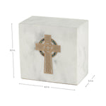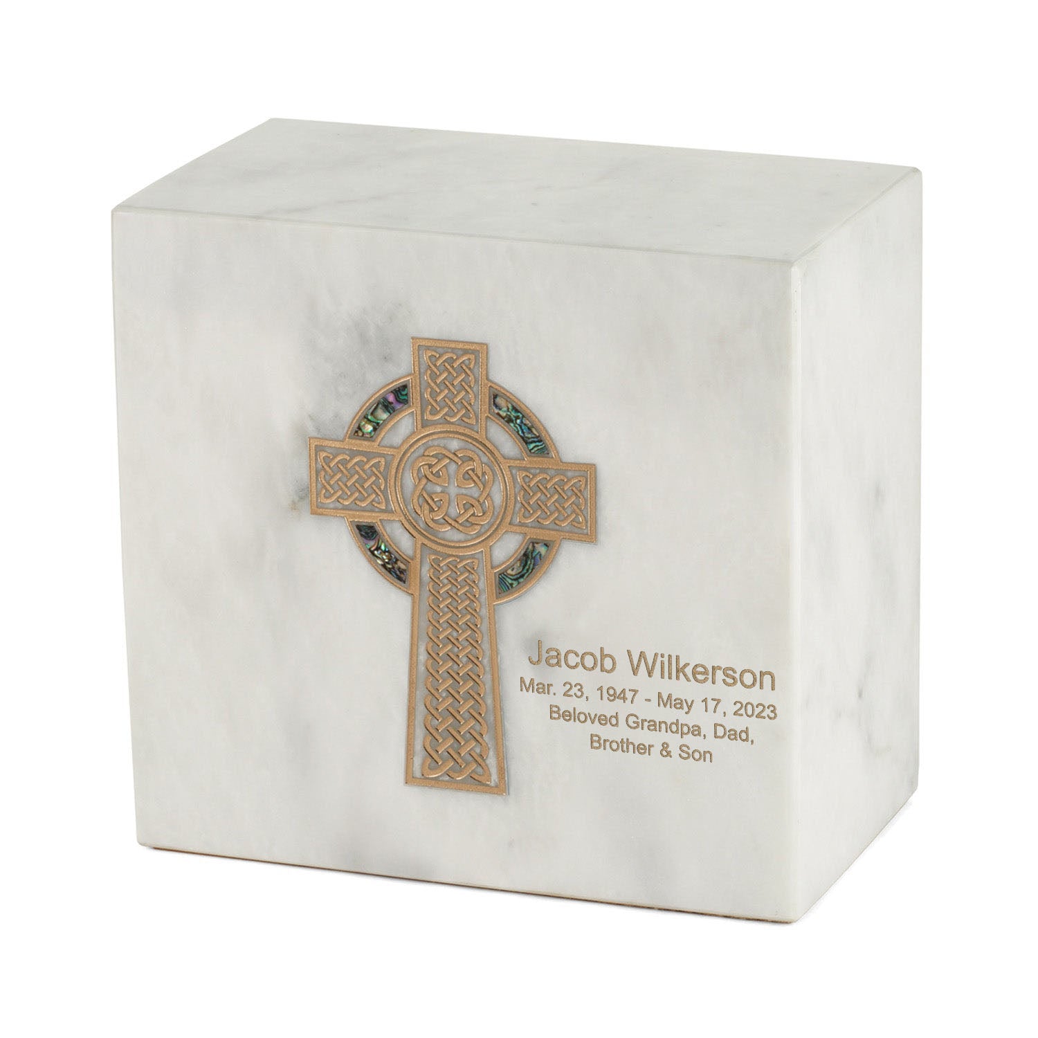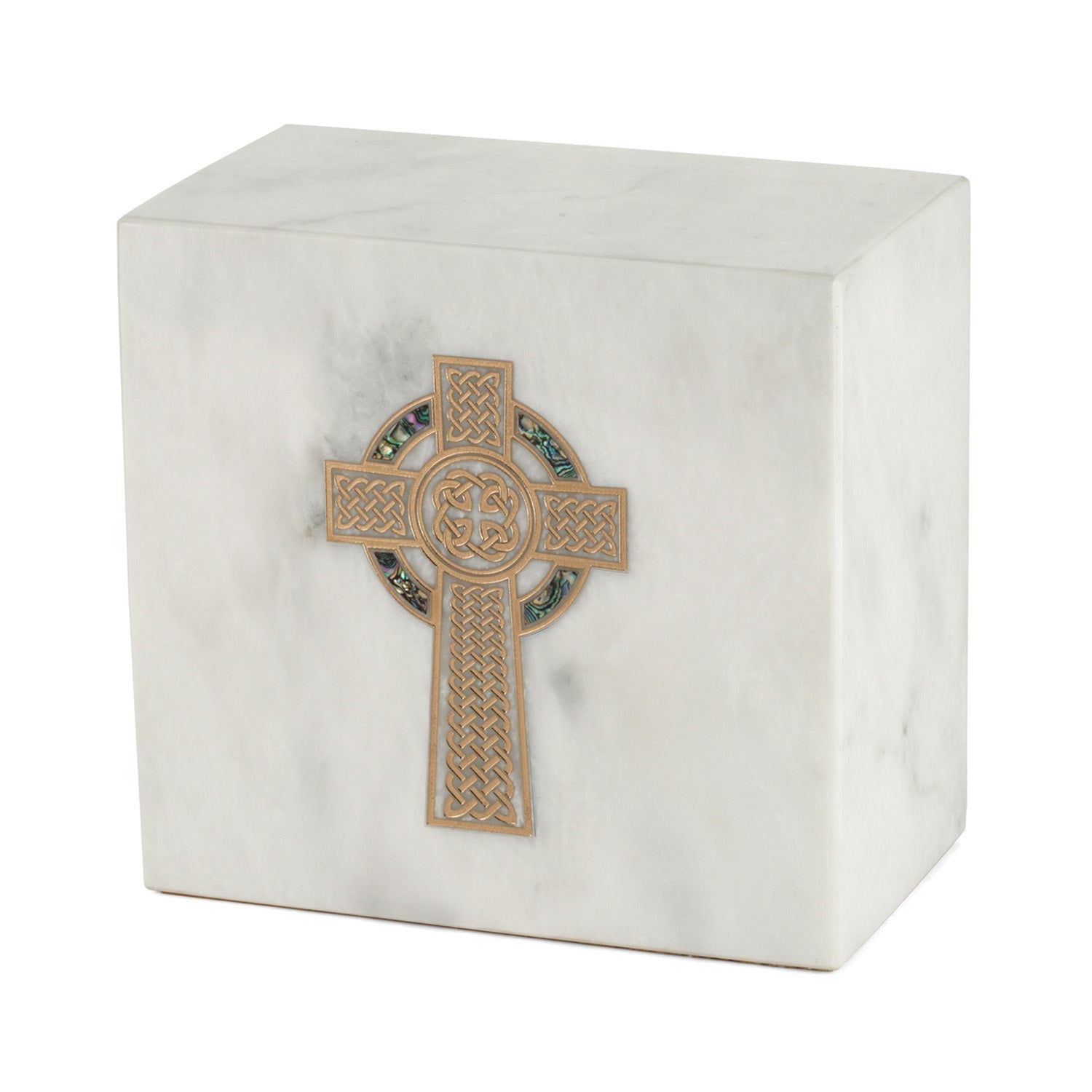 Keystone White Marble Cremation Urn With Gold Celtic Cross + Opulent Blue Inlay