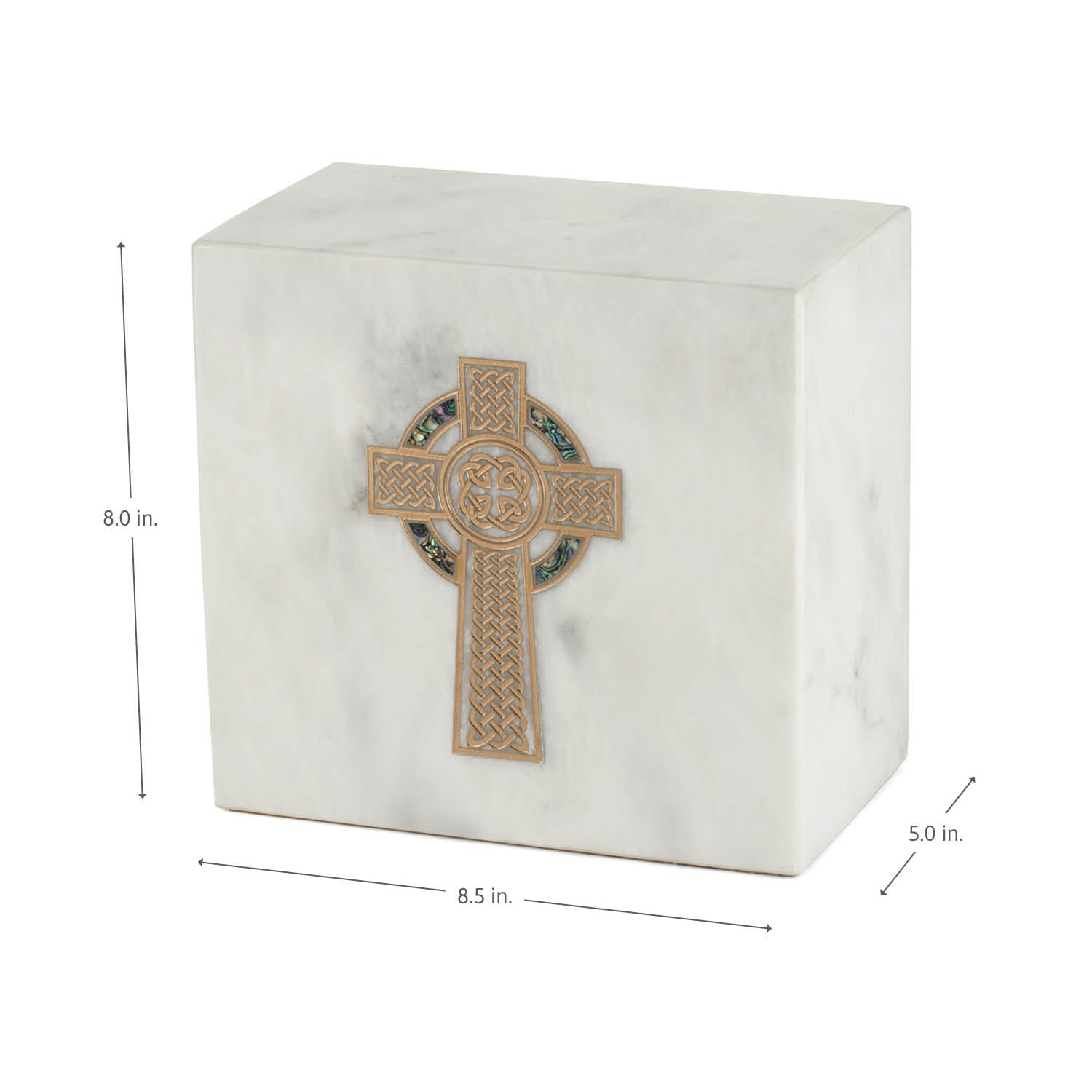 The spirit of a life well-lived shimmers and radiates with love. Exquisite and refined, the custom-crafted artwork on this Keystone White Marble Cremation Urn With Gold Celtic Cross + Opulent Blue Inlay draws attention to the fine details of the natural shell inlay coupled with eternal elegance.