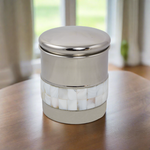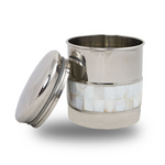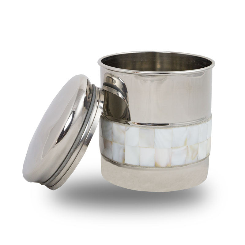 The Metal Pet Cremation Urn with Mother of Pearl Band is manufactured and then brush polished, leaving a uniform, vibrant reflective surface. This is a stylish memorial urn to put on display in the home. It can also be interred in a columbarium or niche or buried with the help of an urn vault.