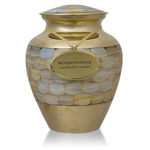 The polished Mother of Pearl Cremation Urn in Small provides a beautiful background for the hand cut mother of pearl pieces, creating a charming balance worthy of becoming your beloved companion’s final resting place. An engravable pendant is available for purchase, for you to be able to add your personal touch.