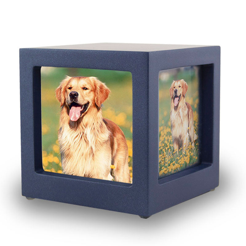 The Navy Pet Photo Cube Urn in Extra Small is a pet urn composed of photographic memories that will ensure their presence is never forgotten. This pet cremation urn is a fitting tribute to a family member who can never be replaced.
