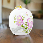 Accented with a copper-plated ring handle, the Peonies Ceramic Cremation Urn In Medium, with its delicate and sweet detail. Featuring  a beautifully vibrant pink peony floral motif over a faded gray Asian city landscape, this urn offers a way to protect the ashes of a beloved child.
