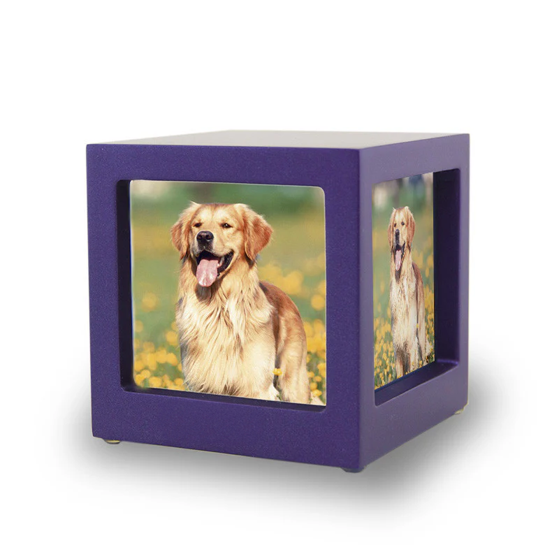 The Violet Pet Photo Cube Urn in Extra Small is a pet urn composed of photographic memories that will ensure their presence is never forgotten. This pet cremation urn is a fitting tribute to a family member who can never be replaced.