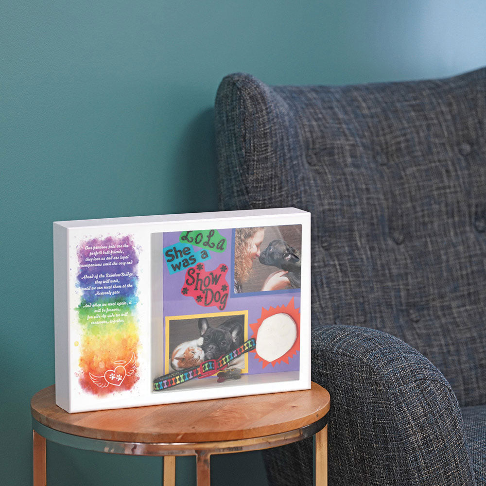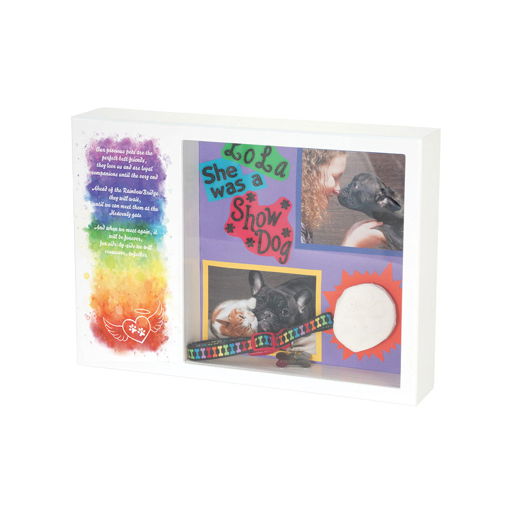 • The large memento compartment (9.7 x 9.7 x 2.75 in) and included photo-board provides space to create a photo collage and to display meaningful mementos such as collars, favorite toys and clay paw prints.