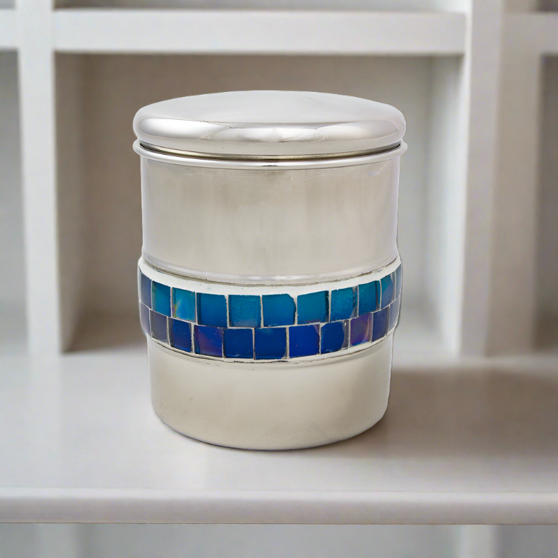 Our Scattering Cremation Urn With Ocean Mosaic Band will certainly become the focal point of any room you decide to display it in. The iridescent blue tiles may remind you of your pet's eyes or all the afternoons you spent lying in the grass, guessing at the shapes of clouds in the sky.