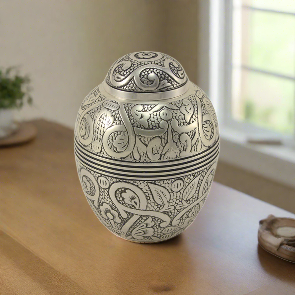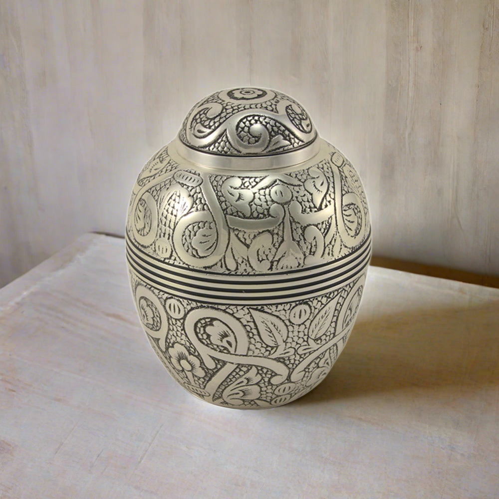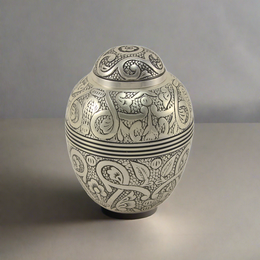 To add a bit of elegance when displaying the cremation ashes of a beloved pet, count on the Silver Embossed Pet Urn in Small. This urn gives off a glow when polished, as it is electroplated in nickel. The textured finish includes a hand engraved floral design for the perfect finishing touch.