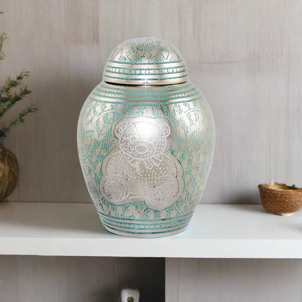 Urn for infants with intricately etched teddy bear and decorative pattern filled with light blue and white paint.
