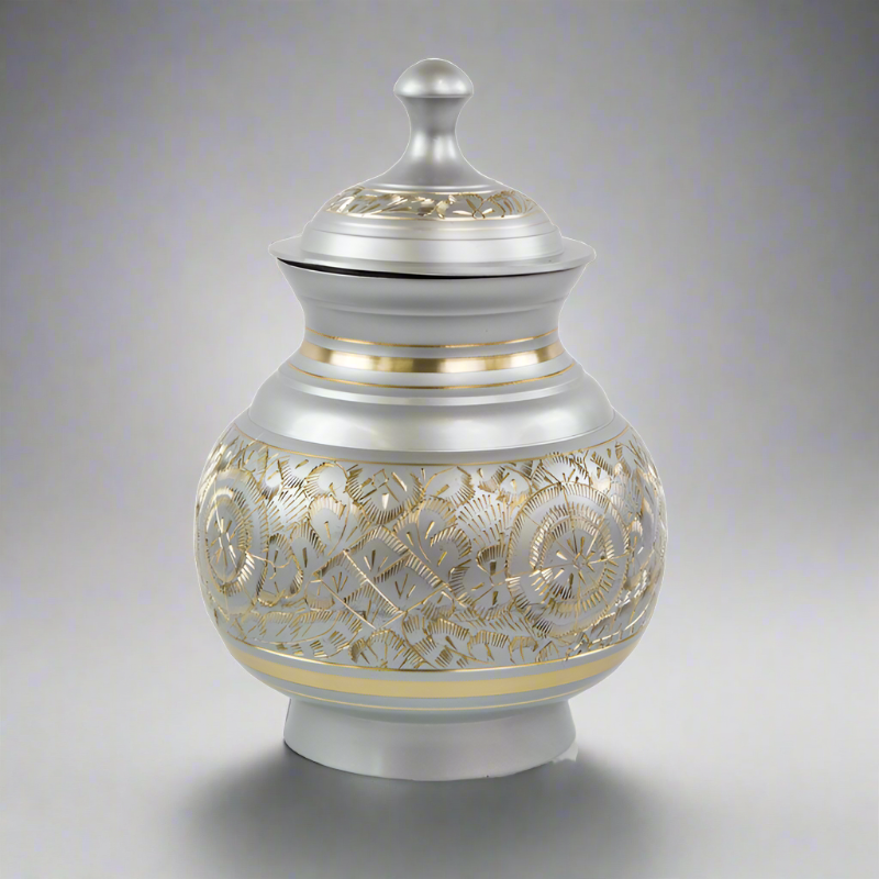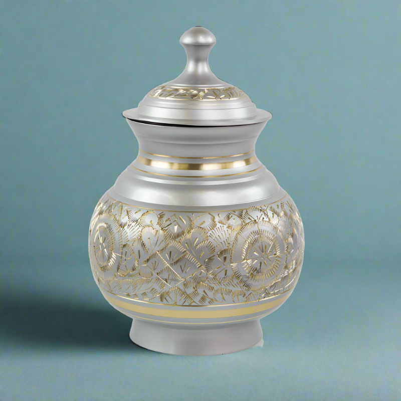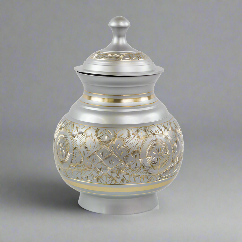 The Timeless Pewter Pet Cremation Urn in Medium is stunning in its rich gold-and-pewter-colored etchings. Crafted by a fine metal artisan, these pleasingly shaped urns for pets will keep memories close at hand. Be it an affectionate kitty, lovable mutt, or pedigreed show dog, all gave unconditional love all the days and nights of their lives.