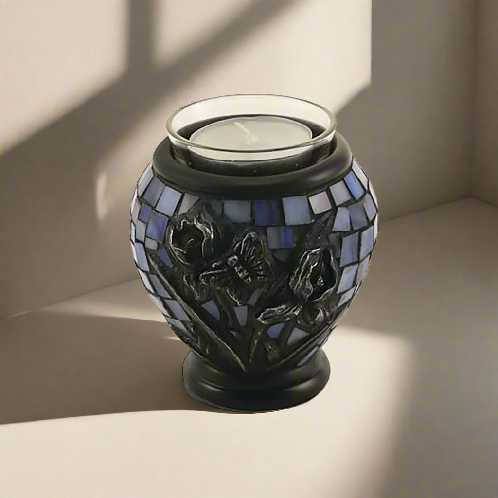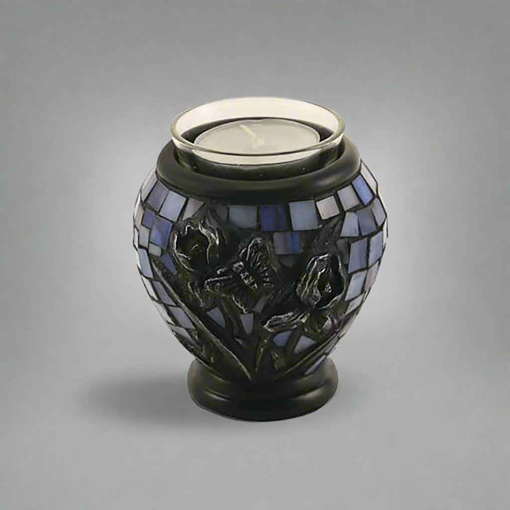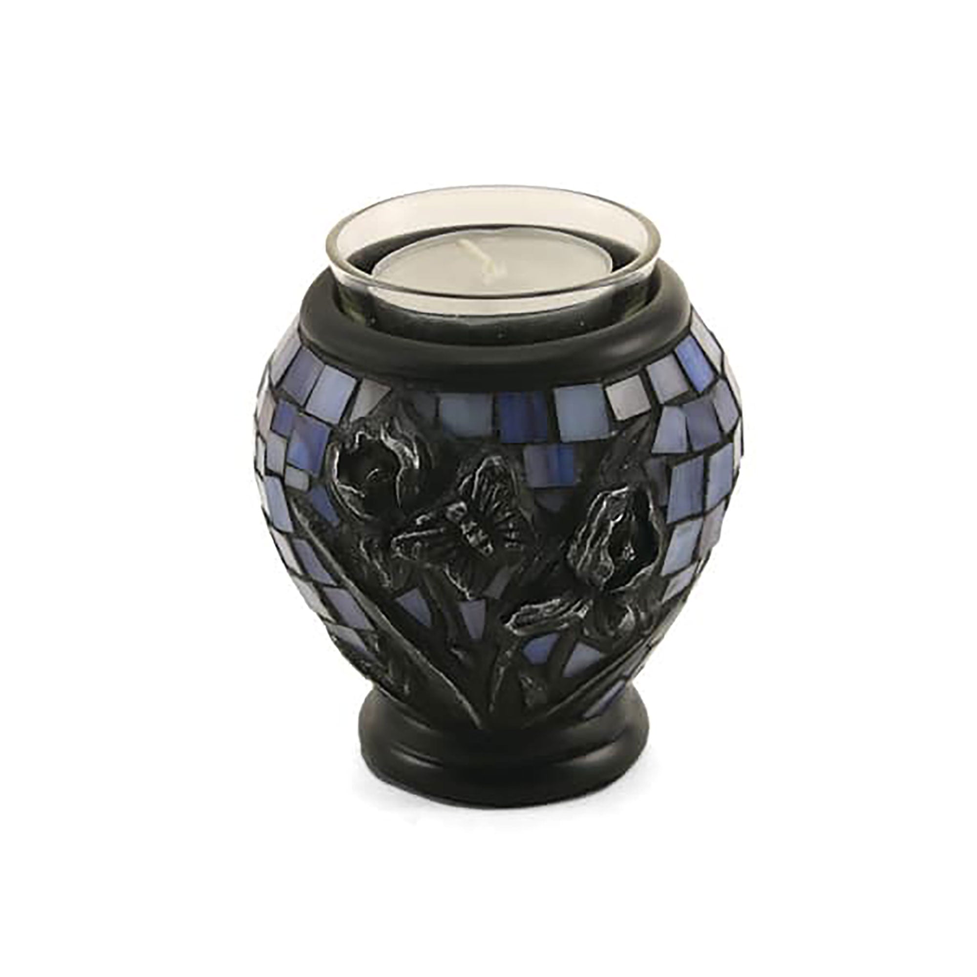 The stunning Mosaic Iris Tealight Candle Keepsake is hand-crafted lovingly with mosaic glass and resin. The end result is a colorful and unique tealight keepsake urn that will add beauty to any decor.  By lighting this candle, one can remember the light that their beloved brought into their life.
