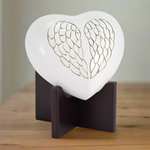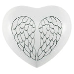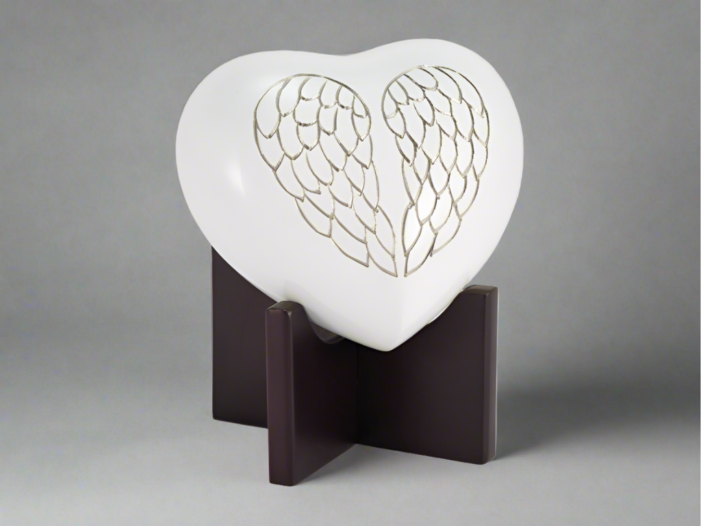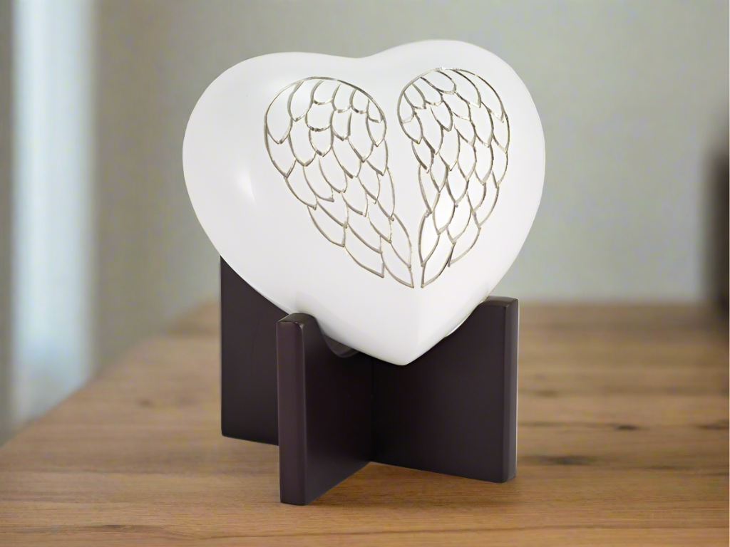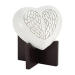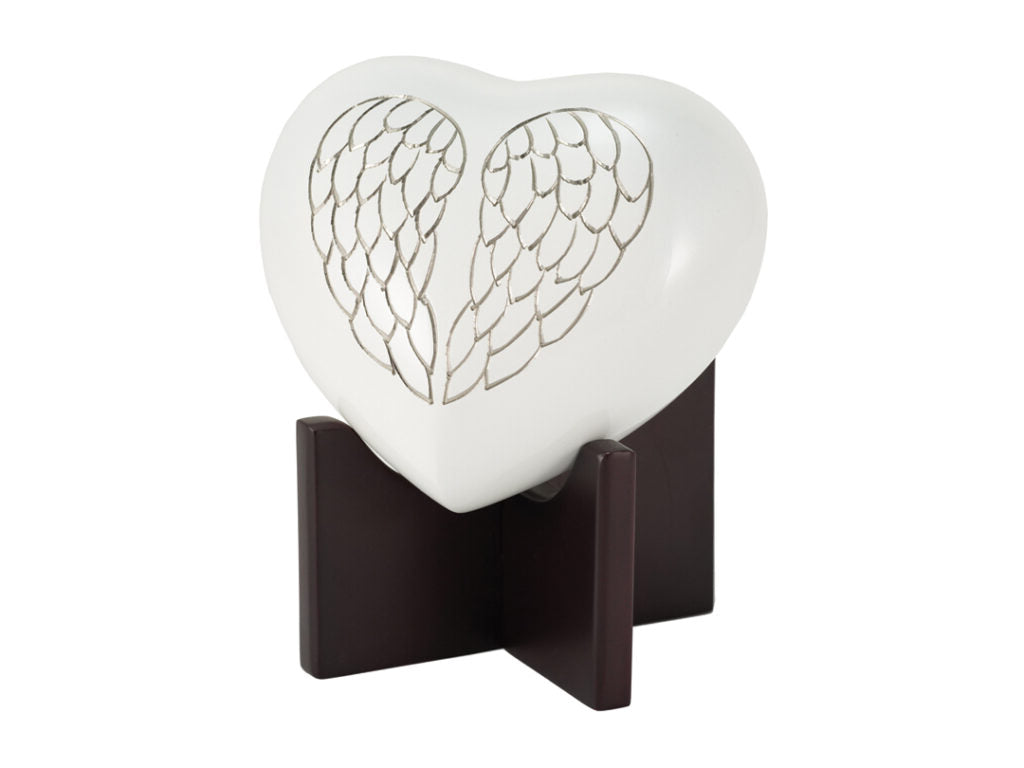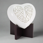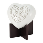 Take comfort and solace during a heart-breaking loss with the In Our Hearts Infant Cremation Urn Angel Wings In Pearl White.  This heart-shaped memorial features one-of-a-kind angel wings which are hand engraved with love, and symbolize protection, hope, and faith.  Includes cherry heart stand for secure display in your home, keeping a close reminder of your love for them nearby.