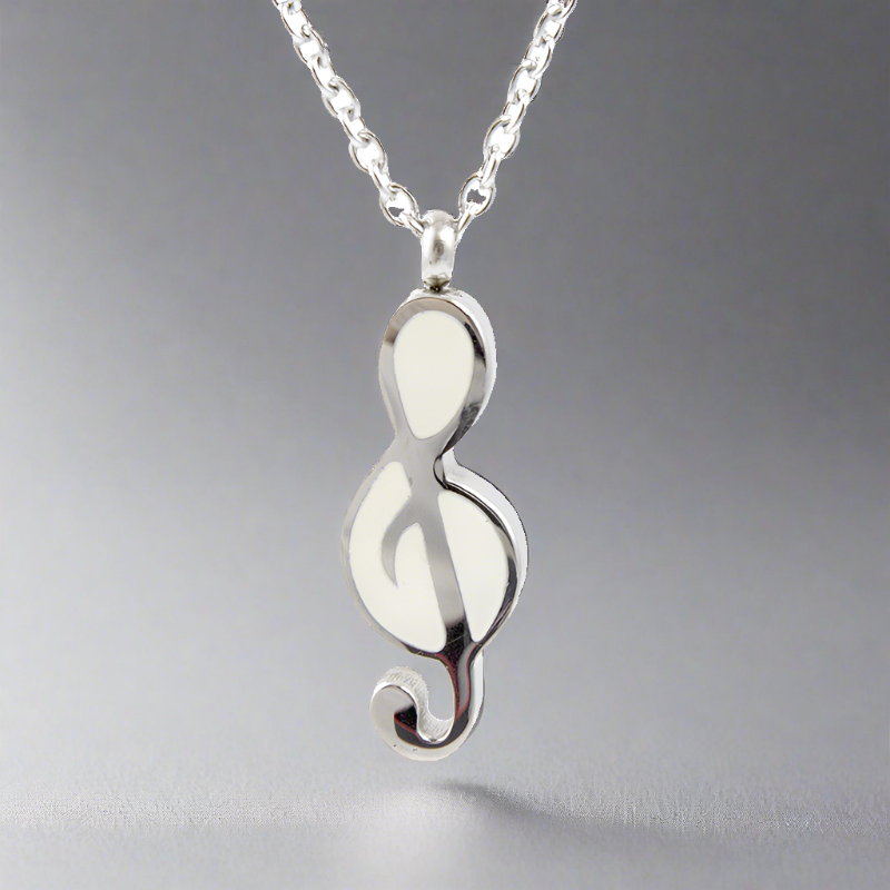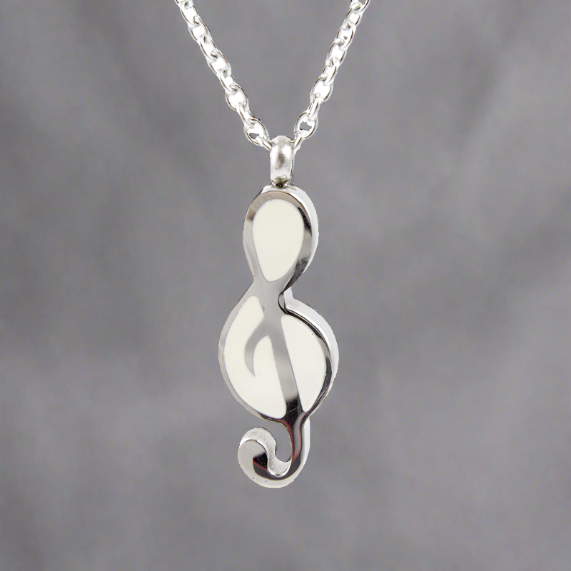 The OneWorld Memorials Silver Cremation Necklace with Treble Clef can remind you of your loved one's passion, what made them really light up. Keep your loved one close to you in the safe embrace of this silver musical cremation necklace. Add your loved one's initials with personalized engraving today.