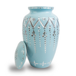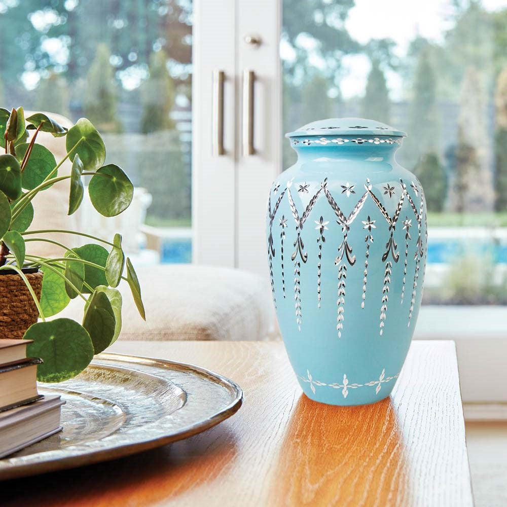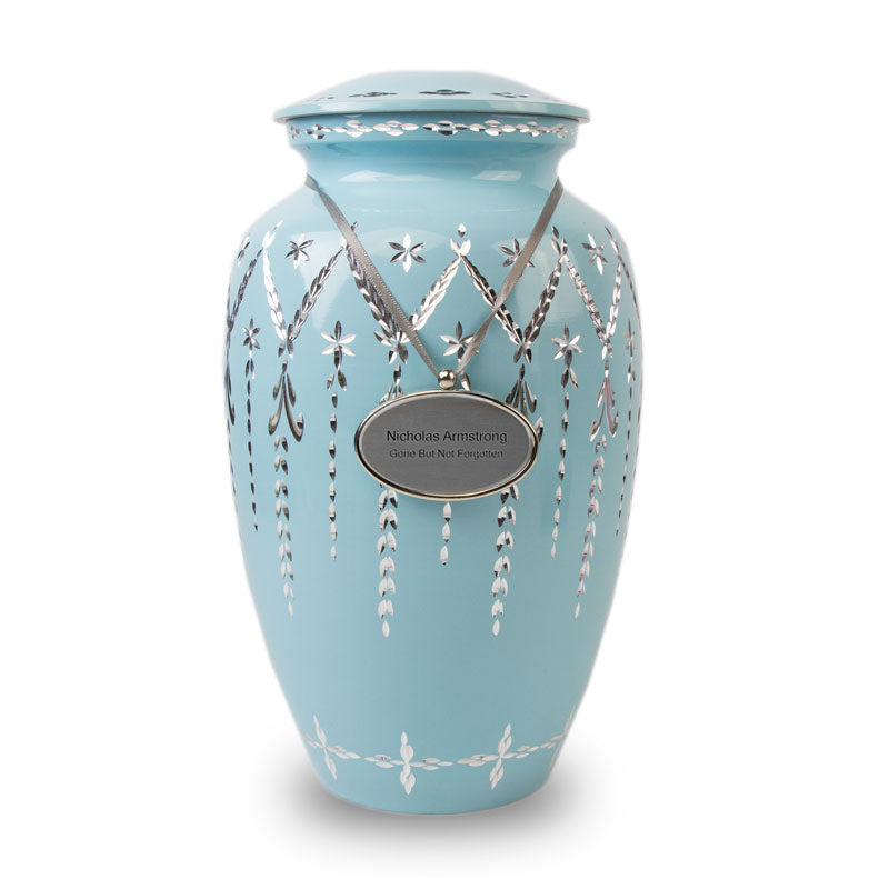 The OneWorld Memorials Light Blue Garland Drop Cremation Urn showcases sparkling stars and snowflakes on a moonlit winter night. Adding an air of elegance, this classic shaped urn features a blue satin enamel finish with carved vine patterns around the lid and body. Add an engraved keepsake pendant to personalize this memorial urn.