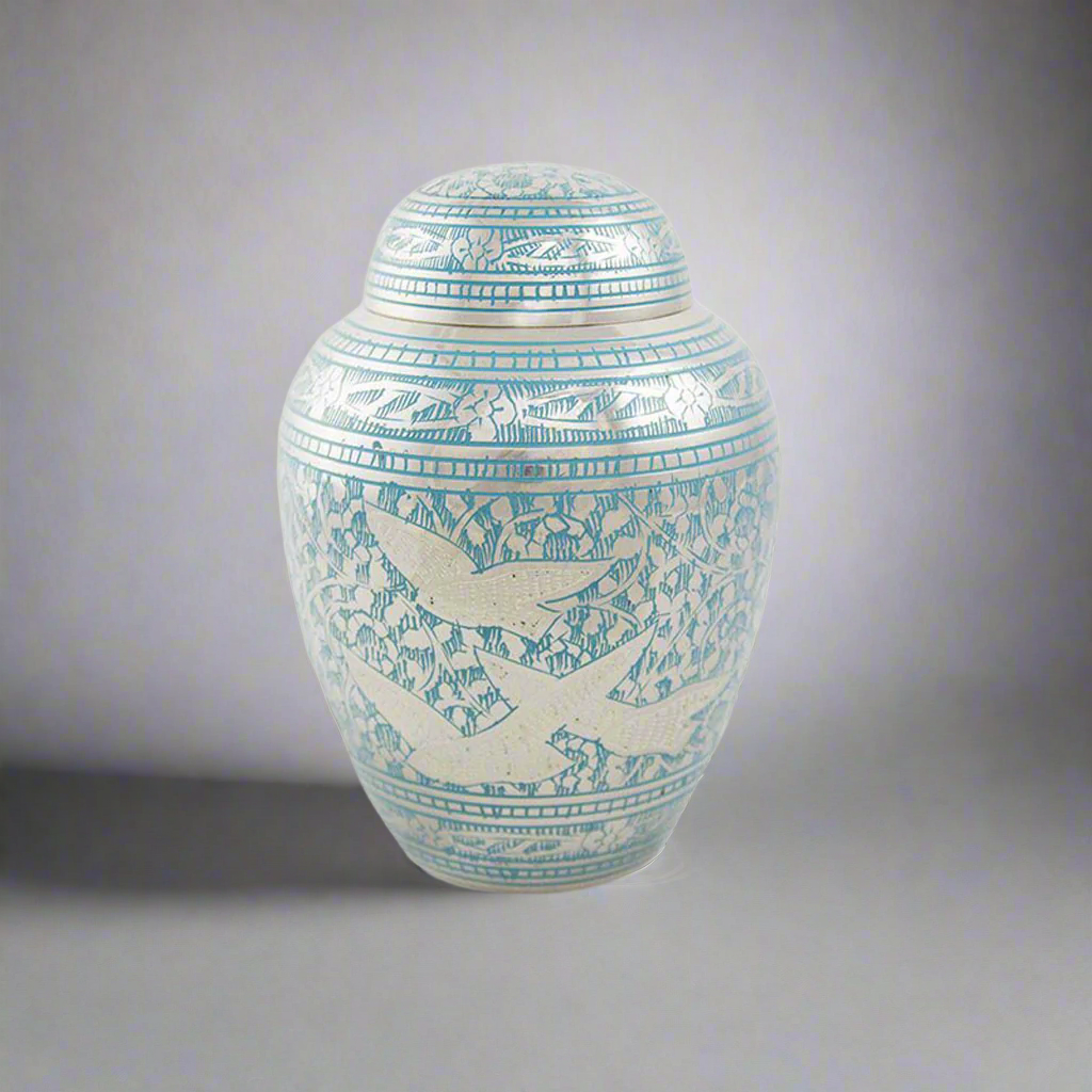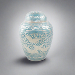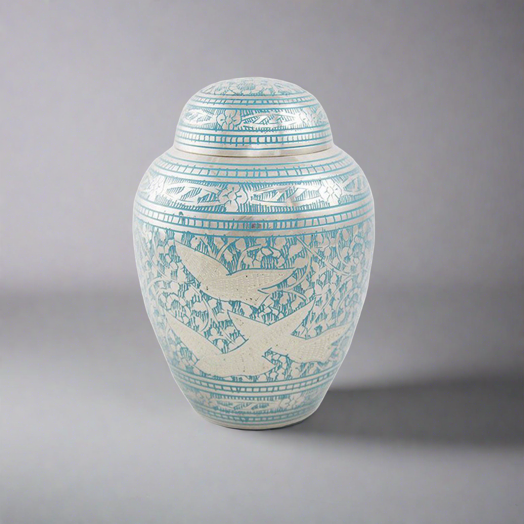 This beautiful OneWorld Memorials Going Home Cremation Urn in Small will serve as a loving reminder of all that you shared, and all the love you will always hold in your heart. The engraved doves flying in the sky lightly filled with blue paint are here to provide you with a calm direction and gentle presence of your loved one.