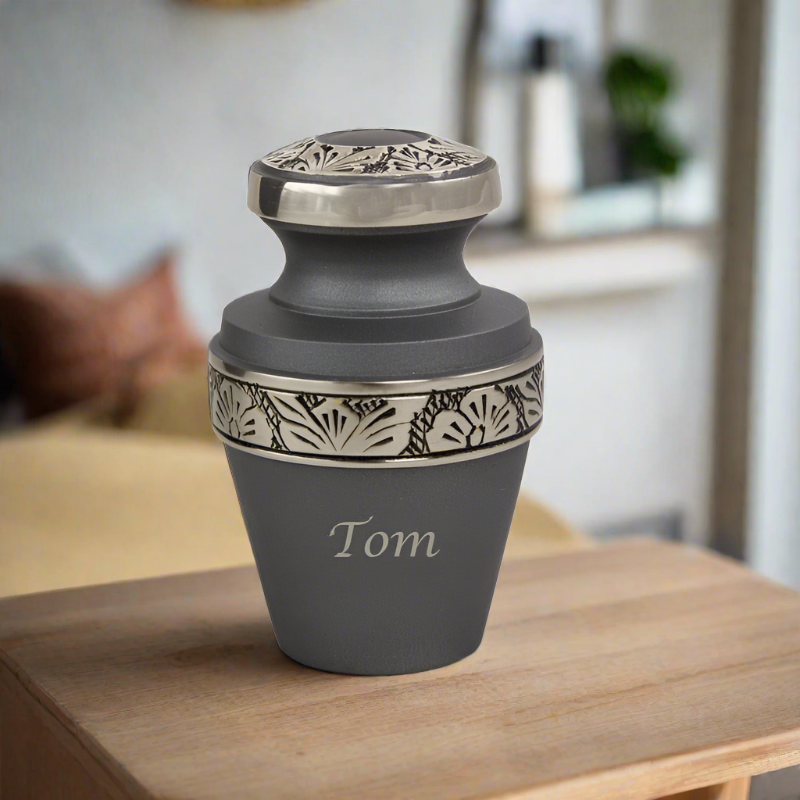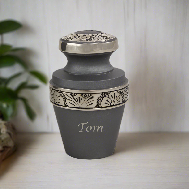 The minimalist single tone brown body of the Rustic Pewter Keepsake Urn allows for the intricately hand etched floral design to pop and catch people’s eye. This is a classic keepsake urn for ashes that doesn’t demand attention, however, when it does catch someone’s eye, it will please whilst evoking memories of cherished times shared.
